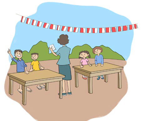 “Nah, barudak, sanggeus urang muji ka Gusti sareng ngadangukeun carios tina Alkitab, ayeuna mah hayu urang teruskeun jeung lomba tea,” ceuk Teh Nia.